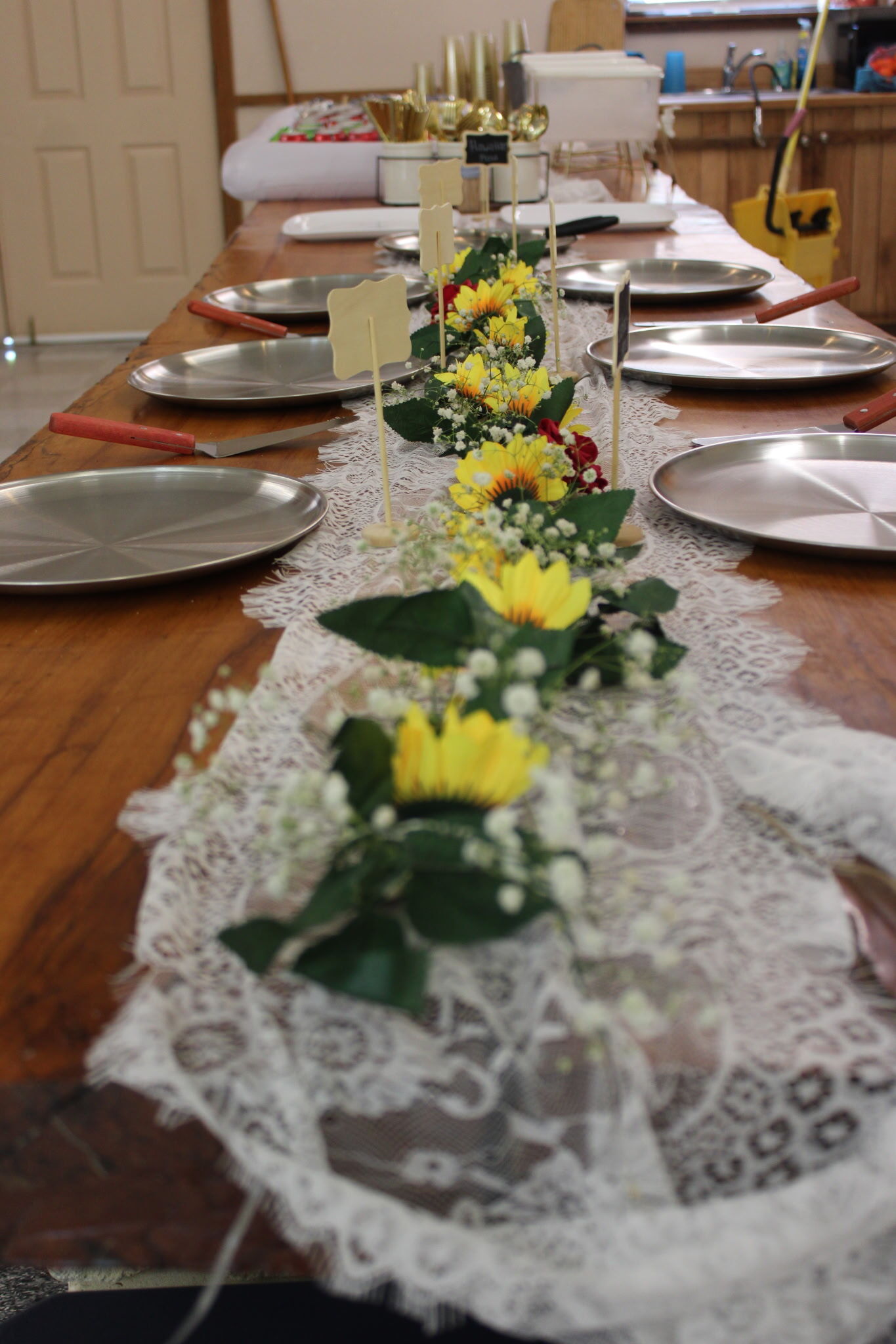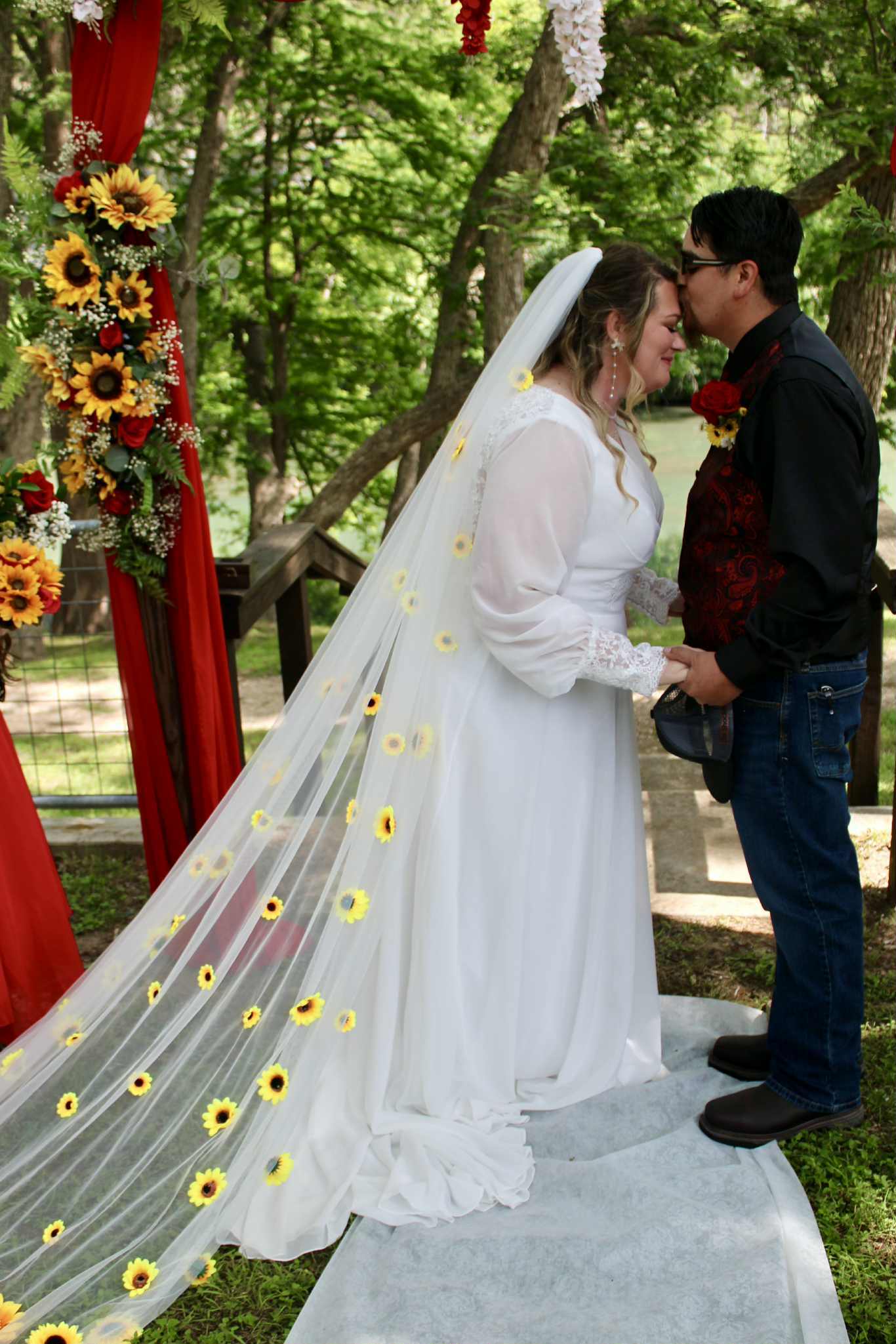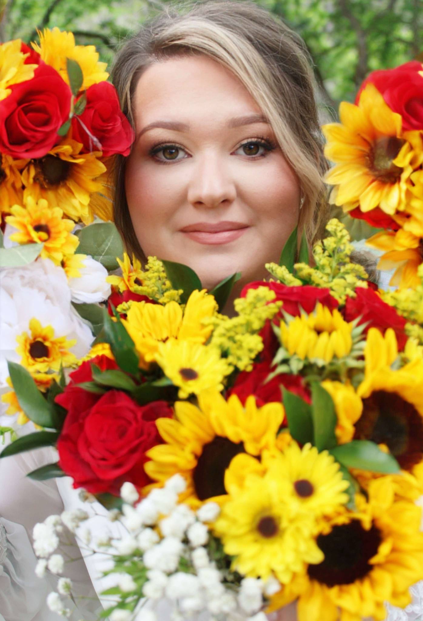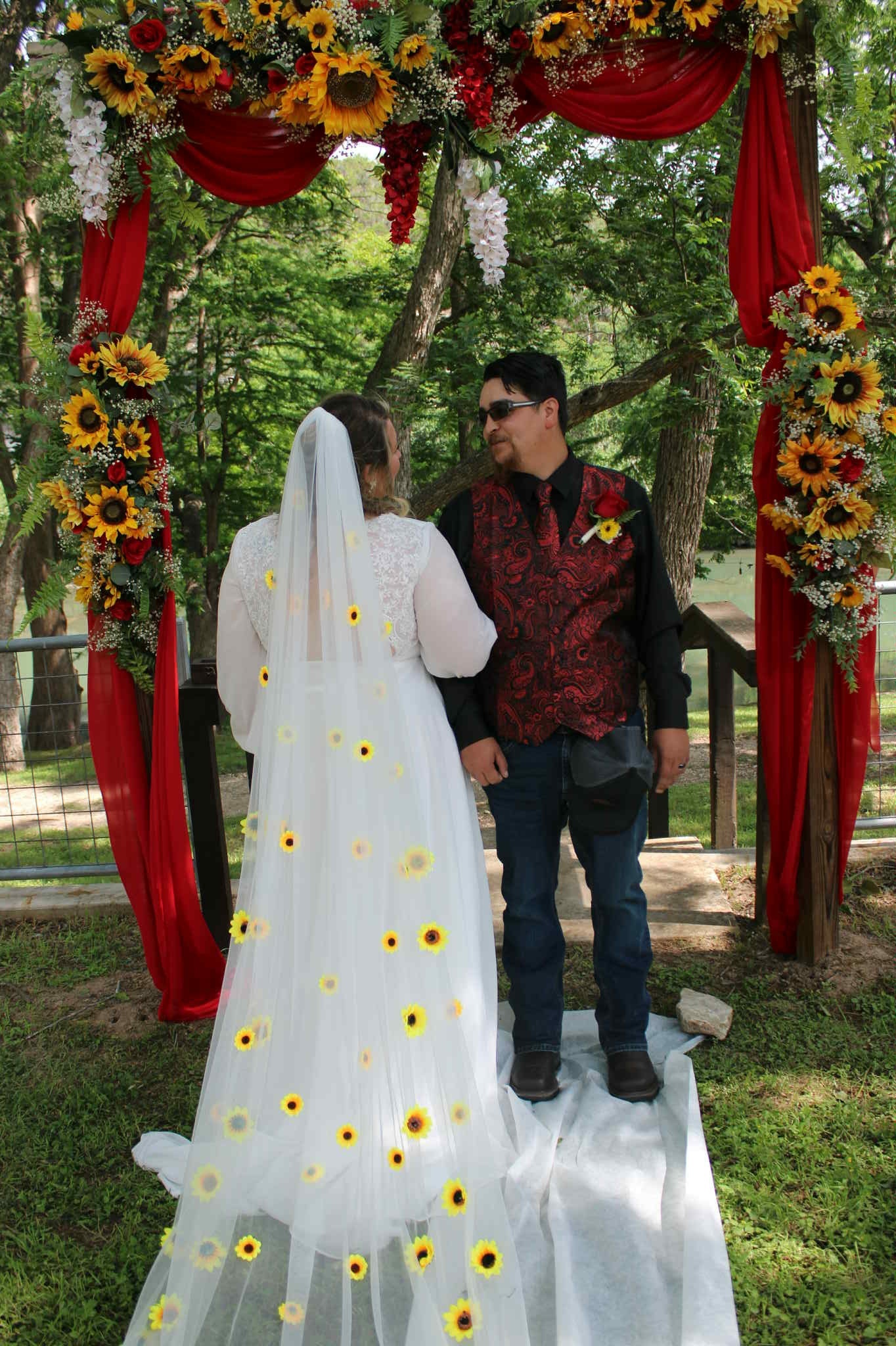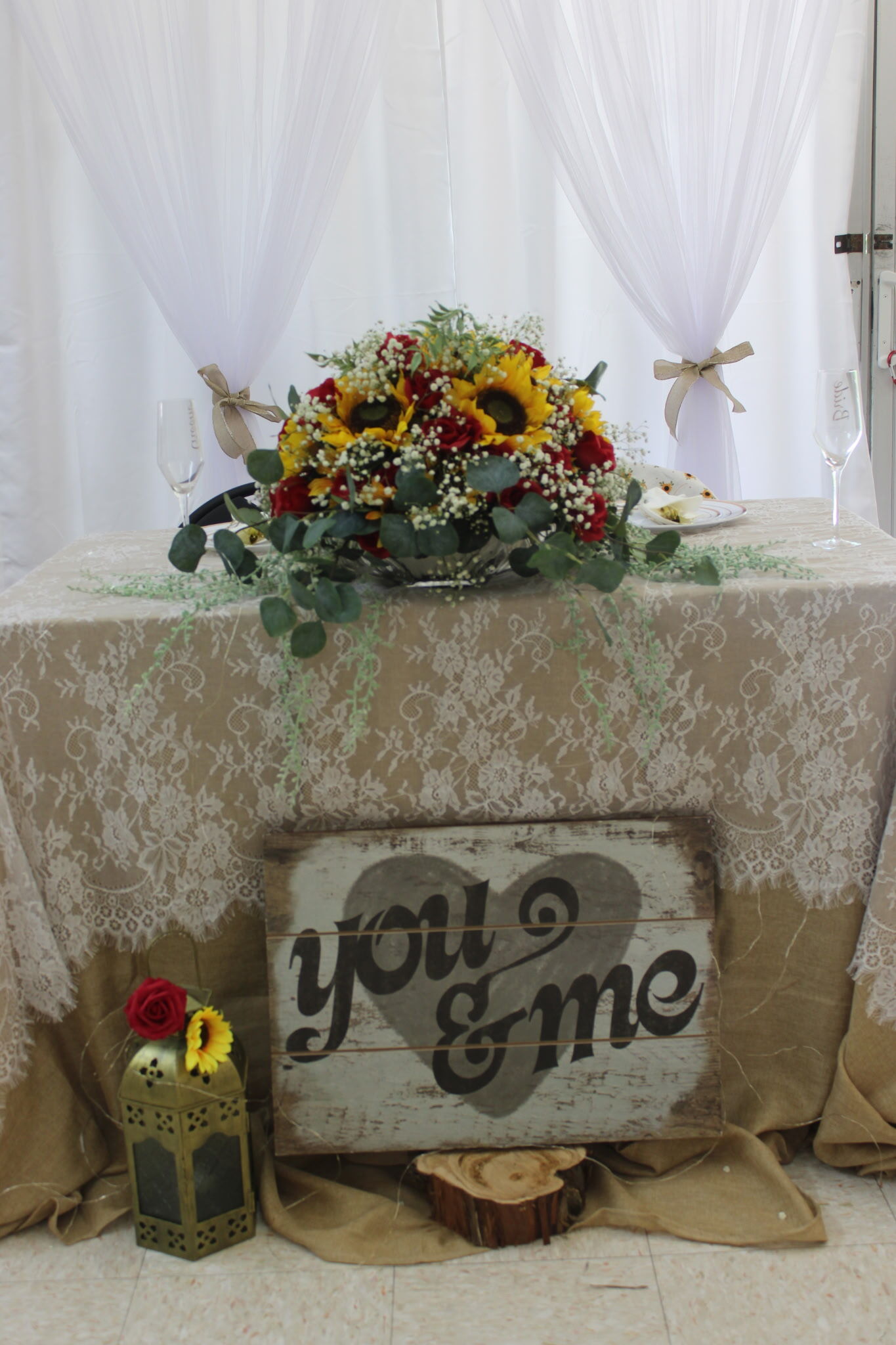 Two champagne glasses labeled “Bride” and “Groom” stand in front of a bright floral arrangement featuring sunflowers, red roses, greenery, and baby's breath on a lace-covered table.
