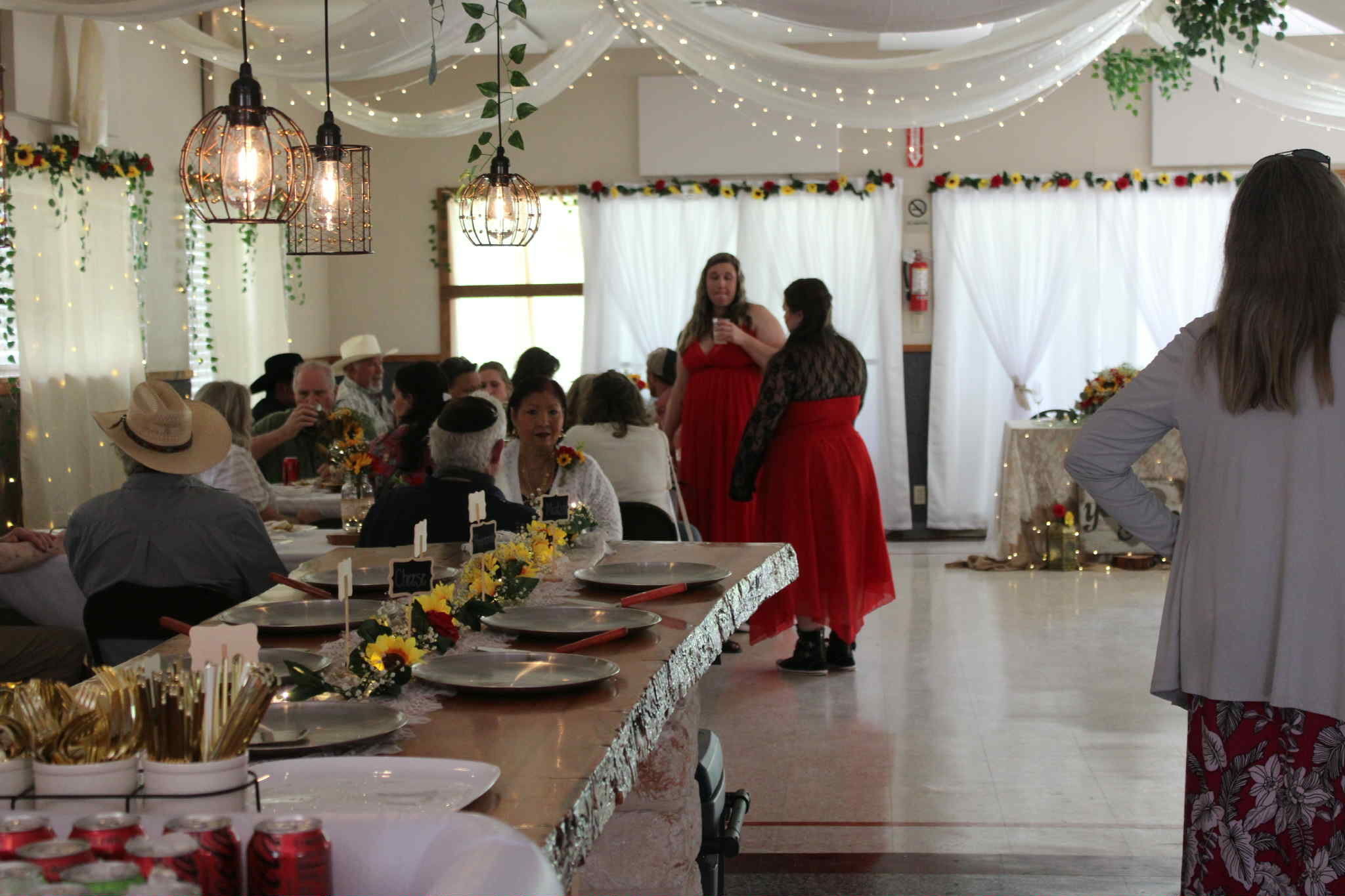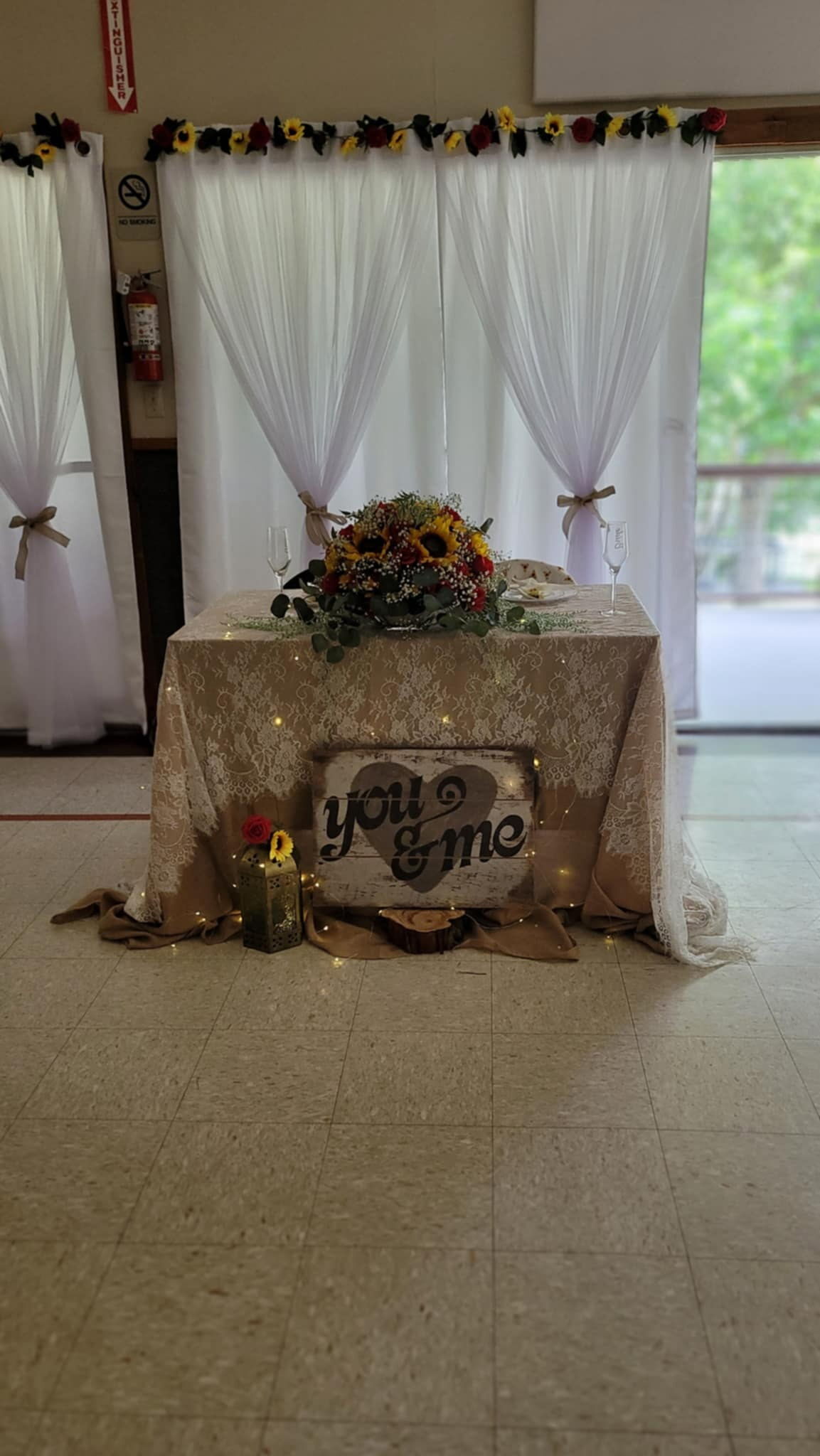A decorated event hall with tables covered in white cloths, floral centerpieces, and a main table with a "Love" sign. White drapes and string lights hang from the ceiling, with sunlight streaming through windows and sliding doors.